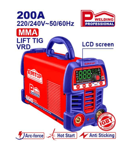 Inwertor tehnologiýasy: IGBT Giriş napräženiýesi: 1~220-240 V Ýygylygy: 50/60 Hz Çykyş togy: 15-200 A Iş sikli: 60% göterimde 200 A Ekran: ŽK Boş ýöreýiş napräženiýesi: 79 V Maks. çykyş togy: 200 A Elektrodyň diametri: 1,6-4,0 mm Funksiýalary: Ýapyşmaýan, Gyzgyn başlaýyş, Dugany güýçlendirmek Toplumynda: 1 sany kabeli bolan elektrod saklaýjy, 1 sany kabeli bolan ýerleşdirme gysgyjy, 1 sany metal şotga, 1 sany şlem Gaplamasy: Reňkli guty