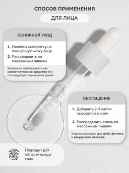 Deri we saç üçin ähliumumy ideg. Çuňňur gidrasiýa, derini dikeltmek we goramak, şeýle hem saçlara ideg etmek üçin döredilen 100% tebigy ösümlik skwalan. Deriniň ähli görnüşleri, esasanam gury, duýgur we garramak üçin amatly. Näme edýär: - Çyglylygyň ýitmeginiň öňüni alyp, lipid barýerini güýçlendirýär - Gyralary ýumşadýar, deriniň çeýeligini ýokarlandyrýar - inflamokançlygy, gyzarmagy we ýalpyldawuklygy aýyrýar - Täzelenmegi çaltlaşdyrýar we beýleki önümleriň täsirini güýçlendirýär - Saçlary dikeldýär, ýumşak we ýylmanak edýär Esasy maddalar: 🔸 100% ösümlik skwalany (zeýtun ýagyndan) - nemlendirýär, goraýar, deriniň we saçyň täzelenmegine kömek edýär, işjeň maddalaryň aralaşmagyny güýçlendirýär Aýratynlyklary: ✔️ 100% tebigy düzümi Children Çagalaryň we duýgurlaryň hemmesini öz içine alýan ähli deri we saç görnüşleri üçin amatly Face faceüzüň fitnesi we wakuum massaagey üçin amatly Allerg Allerns we gaharlandyryjy komponentler bolmasa Nädip ulanmaly: GÖRNÜŞ 1-nji usul: serumu ýüzüň arassalanan derisine çalyň. Massa lines çyzyklary boýunça paýlaň. Göz meýdany üçin amatly. Soňra krem ulanylmazdan, özbaşdak önüm hökmünde ulanylyp bilner. 2-nji usul: kremiň içine 2-3 damja serum goşuň. Garyndyny massa lines çyzyklary boýunça ýaýlaň. 3-nji usul: eliňizde az mukdarda serum gyzdyryň. Köklerden gaça durup, saçyň tutuş uzynlygyna ýaýlaň. .Uwma. Günüň dowamynda gün şöhlesini ulanmaly: gyşda, güýzde we ýazda azyndan 30 SPF, tomusda azyndan 50 SPF. Duýduryş: Goşundylara aýratyn çydamsyzlyk mümkindir. Kompozisiýa: Skwalan (Zeýtun ýagyndan skwalan).