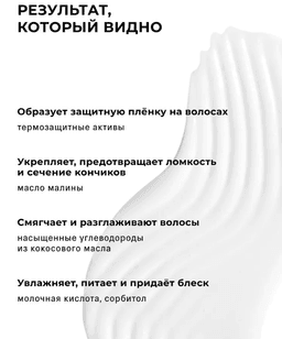 Her gün ulanmak üçin niýetlenen, ýuwulmaýan praýmer (praýmer) saçlary düzülişige taýýarlaýar, ýylmanaklaýar, daramagy aňsatlaşdyrýar, elektriklenmeden, göwrümlilikden (puşistost) we termiki zeperlenmelerden goraýar. Çyglandyryjy formula aňsat ýaýraýar, gurluşyny agyrlaşdyrmaýar, saçlara ýylmanaklyk, ýumşaklyk we kaşaň ýalpyldawuk öwüşgin berýär. — termogorag we çyglylykdan goraýyş häsiýetlerine eýe — saçlary zeperlenmekden we çyglylygyny ýitirmekden goraýar — saçlary düzülişige taýýarlaýar, düzülişik wagtyny gysgaldýar — statiki elektriklenmäni aýyrýar — ýylmanaklaýar — daramagy aňsatlaşdyrýar — düzülişigiň has uzak saklanmagyna kömek edýär Göwrümi: 150 ml Praýmer — kosmetiki serişdeleri ulanmazdan öň ulanylýan esas, taýýarlaýjy serişde. Termiki zeperlenme — saç guradyjynyň, utýugyň ýa-da maşanyň ýylylygy sebäpli ýetýän zeper. Statika (elektriklenme) — saçlaryň biri-birine ýa-da eşiklere ýapyşmagy. Glanes — ýalpyldawuk, aýna ýaly öwüşgin.