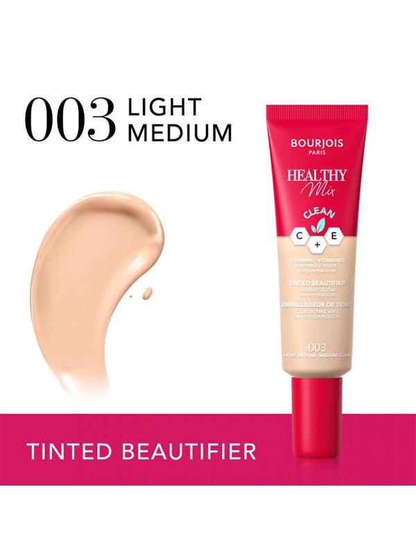 Aýratynlyklary Reňk: №003 LIGHT MEDIUM Göwrümi: 30ml Düşündiriş Bourjois Healthy Mix Clean tonal kreminiň gözenekleri ýapmaýan we deriniň dem almagyna mümkinçilik berýän suwuk we ýeňil gurluşy bar. Tonal kremini owadan ulanylýar we deriniň üstünde aňsat ýaýraýar. Orta örtügi we tebigy ýarym mat görnüşli we çalmak üçin örän amatly. Ulanyş tertibi Barmagyňyz ýa-da ýörite gubka bilen tonal kremi çalyň. Burnuňyza, maňlaýyňyza, eňegiňize we ýaňaklaryňyza çalyň. Birkemsiz täsir etmek üçin, ony kemçilikleri we ýadawlygyň alamatlaryny ýapmak üçin garyşdyryň.