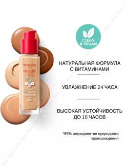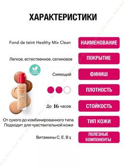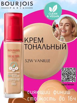 Aýratynlyklary Reňk: №52W VANILLA Göwrümi: 30ml Düşündiriş Bourjois Healthy Mix Foundation tonal kremi. Witamin-miwe toplumy bilen ýumşak we ýeňil gurluş, kemçilikleri gizleýär we ýagty we kemsiz äheňe ýetmäge kömek edýär. Esasy deriniň tebigy ýagtylygyny ýokarlandyrýar we çeýeligi ýokarlandyrýar, ýygyrtlaryň çuňlugyny göz bilen peseldýär. Ýagtylygyň we çyglylygyň täsiri 8 sagat dowam eder. Ulanyş tertibi Önümiň az mukdaryny maňlaýdan eňek çyzygyna çenli çygly ýüzüňize çalyň we barmaklaryňyz ýa-da gury gubka bilen paýlaň.