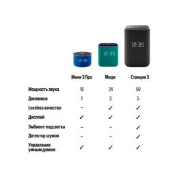 Ýandex Stansiýa 3 — Alisa bilen iň täsirli akylly dinamik Ýandex Stansiýa 3 — interýer ambient-yşyklandyrmasy, täsirli sesi we öýüňiziň howpsuzlygy üçin giňeldilen ssenariýalary bolan iň döwrebap akylly dinamikdir. Ol töwerekdäki atmosferany dessine üýtgedýär we size mahsus bolan aýratyn giňişligi döredýär. Yşyk we reňk bilen özgerdýär Dinamigiň yzky panelinde 16 million reňki goldaýan ambient-yşyklandyrmasy ýerleşýär. Her dürli ýagdaýlar üçin taýýar yşyk reňklerini saýlaň ýa-da öz ssenariýalaryňyzy düzüň. Sazly yşyk: Yşyklandyrma sazyň depginine görä üýtgäp durýar. Diňe: «Alisa, sazly yşyk düzümini aç» diýseňiz ýeterlik. Stroboskop: Edil reýv-meýlislerindäki ýaly — ýagty yşyk çyralary sazyň ritmi bilen gabat gelip, öýüňizde tans meýdançasynyň atmosferasyny döreder. Şem: Otagy ýyly sary-narynç yşyk bilen doldurýar we Alisa kaminiň ýakymly sesini açar. Töwerekleýin LED-yşyklandyrma we displeý LED-yşyklandyrma: Dinamigiň ýokarky böleginde ýerleşýär. Ol Alisa ýüzleneniňizde ýa-da ýatlatmalar işlän wagty yşyk oýunlary bilen size jogap berýär. LED-displeý: Ön tarapyndaky piksel displeý wagty, howa ýagdaýyny we Alisanyň duýgy reaksialaryny görkezýär. Siziň keýpiňize laýyk sazlar Stansiýa 3-däki Alisa tutuş otagy doldurjak sazlary saýlamagy başarýar. Halan aýdymlaryňyzy, şahsy maslahatly «Meniň tolkunym» (Moya volna) akymyny, podkastlary we kitaplary diňläň. Çagalar üçin bolsa aýdymlar, ertekiler we hüwdüler bar. Sazy sesiňiz ýa-da el degirmegiňiz arkaly dolandyryň. 50 Wt göwrümli ses Ýandex Stansiýa 3-niň güýçli we çuňňur sesi hakyky immsersiw täsirini döredýär. Akustik ulgamynyň aýratyn gurluşy sesi maksimum derejede göwrümli edýär, öňdebaryjy algoritmler bolsa sesi otagyň ölçegine görä sazlaýar. Siziň aladaňyzy edýän akylly öý Ses detektory: Dürli sesleri tanaýar we ssenariýalary sazlamaga kömek edýär. Mysal üçin, el çarpylyp yşyk öçürilip bilner ýa-da pişik mýawlasa akylly iýmitlendiriji işläp biler. Zigbee™ we Matter™ goldawy: Akylly öý enjamlaryny (Wi-Fi, Zigbee, Matter) gönüden-göni birikdiriň. Ssenariýalar hatda internet bolmadyk ýagdaýynda-da işlär. Häsiýetnama, Maglumat Umumy güýji : 50 Wt Yygylyk diapazony : 65 Gs — 20 kGs Dinamikleriň sany : "2 sany pes yygylykly (NÇ), 2 sany passiw yzlaýjy" Mikrofonlaryň sany : 6 sany Simsiz baglanyşyk : "Wi-Fi (2.4 GGz / 5 GGz), Zigbee" Iýmitlenişi : Elektrik torundan (Type-C arkaly) Ölçegleri : 132 x 201 x 132 mm Agramy : 1.76 kg