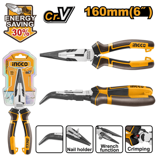 INGCO HHLNP28160 160 mm inçe dodakly gysgyjy (tonkogubsy) el ýetmesi kyn bolan ýerlerde ulanmak üçin çydamly we amatly guraldyr. Kesiji gyralary simleri kesmek üçin niýetlenendir, gysyjy bölegindäki dişler bolsa uşak şaýlaryň ygtybarly tutulmagyny üpjün edýär. Gural güýçlendirilen gurluşa eýedir; şarniriň kesiji gyralara golaý süýşürilmegi (High leverage) saýasynda kesiş netijeliligi 30% ýokarlanýar. Gural poslama we zeperlenmelere durnukly bolan hrom-wanadiý (Cr-V) poladyndan ýasalandyr. Iki komponentli we iki reňkli TPR plastikden hem-de rezinlenen materialdan ýasalan büdür-südür tutawaçlary elden taýmagyň öňüni alýar. Tutawaçlaryň aşaky bölegi goşmaça diregler bilen enjamlaşdyrylan bolup, olara asylýan gural berkidijisini dakmak mümkindir.