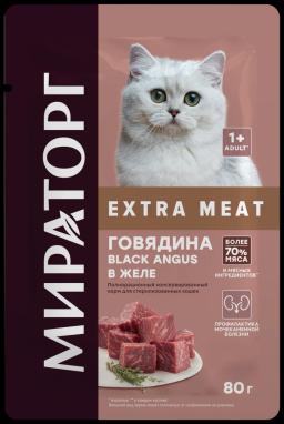 Tohumlaryň sterilizasiýa edilen pişikleri üçin “Miratorg Extra Et” (sousdaky sygyr eti) sousda sygyr eti bolan uly ýaşly pişikler üçin doly çygly iýmitdir. Üstünlikleri: Easyeňil siňdirmek üçin ýokary siňdirilýän belok bilen prebiotikleriň birleşmesi Deňagramly mineral düzümi peşew ulgamynyň saglygyny saklaýar Sogan ýagyndan we sinkden Omega-3-iň birleşmegi, haýwanlaryň derisiniň we paltosynyň saglygyny üpjün edýär.