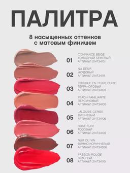 Aýratynlyklary Reňk: №07 ВИННО-КОРИЧНЕВЫЙ Göwrümi: 5ml Düşündiriş VOLUMMATTE, mat gutarýan we klassiki nýuddan baý şeraba çenli sekiz kölegede ýyladyş täsir ediji suwuk pomada. Iň gowy mahmal görnüşini döredýär we dodaklary duýgur, täsirli we görüş taýdan has göwrümli edýär. Yapyşmazdan rahat mat gutarmak üçin gowulandyrylan formula bilen kremli, ýokary pigmentli dokumasy, çalt düzülýär, derini guratmaýar ýa-da berkitmeýär. Pomada perde ýaly dowam edýär, deň derejede ýaýraýar we ilkinji goýmadan baý reňk galdyrýar. VOLUMMATTE pomada gabat gelmek üçin ýumşak duýgur örtükli lakon mat çüýşede gaplanýar. Ýumşak egrilen aplikatoryň kömegi bilen, dodak konturyny galam ulanman jikme-jik boýamak amatly. Ulanyş tertibi Dodaklaryň ortasyndan kontura çenli pomada çalyň. Has uzak dowam edýän makiýaž üçin ilki bilen dodagy maska ýa-da balzam bilen ýumşadyň.