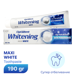 “Ciptadent Whitening”, “Lion Japan” -yň “PowerWhite” tehnologiýasy bilen işlenip düzülen 190g aklaýjy diş pastasydyr. Dişleri has täsirli arassalamagy üpjün edýär we tebigy ak reňkini dikeltmäge kömek edýär.
