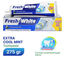 Fresh & White Extra Cool, uzak wagtlap dowam edýän täze demi we täsirli agyz bejergisine baha berýänler üçin güýçlendirilen täsir ediji diş pastasydyr. Mentol bilen düzülen formula demiň täzelenmegine kömek edýär, dişleri hapalardan gowy arassalaýar we kariesiň öňüni alýar.